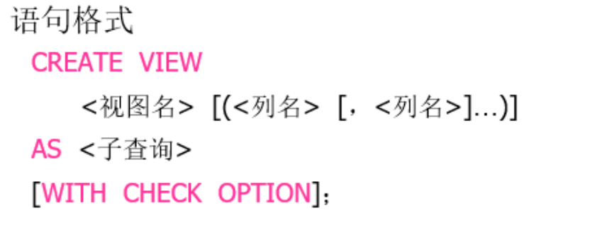 - WITH CHECK OPTION:对视图进行 UPDATE,INSERT 和 DELETE 操作时要保证更新、插入或删除的行满足视图定义中的谓词条件(即子查询中的条件表达式)