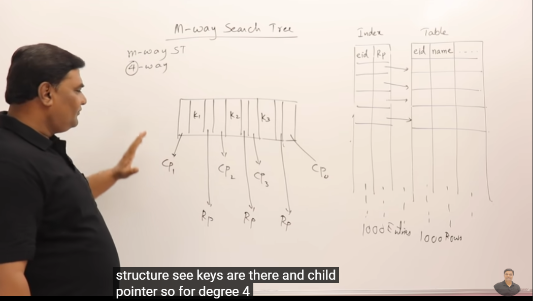 结构(以 4-way 树举例):【pointer 1】【k 1】【record pointer 1】【pointer 2】【k 2】【rp 2】【pointer 3】【k 3】【rp 3】【pointer 4】 每个child pointer
