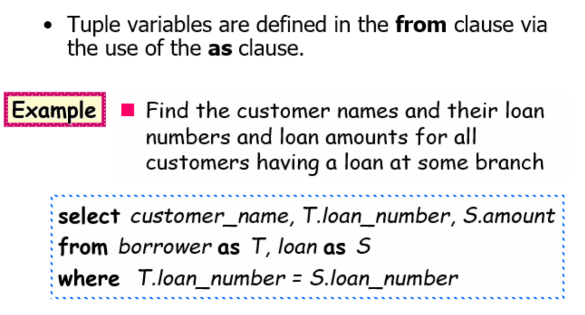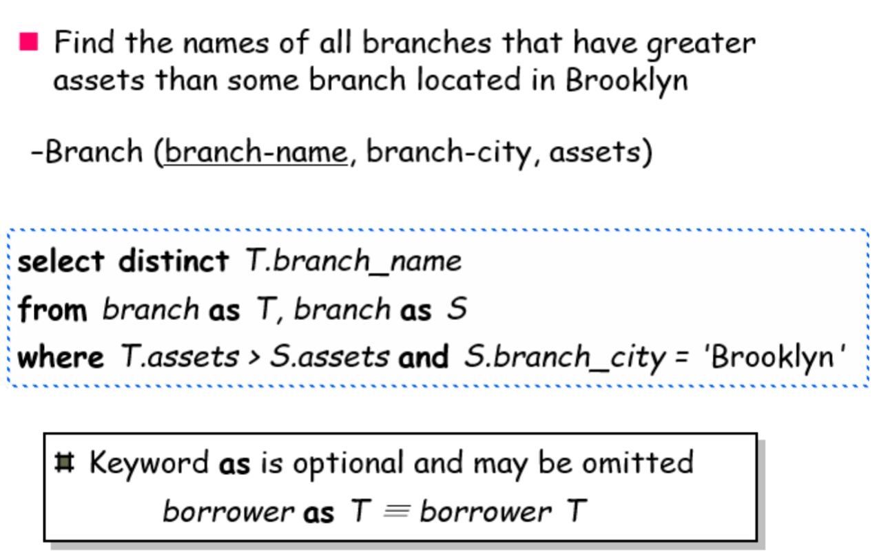 - Select distinct: elimination of duplicates; 作用于所有的目标列